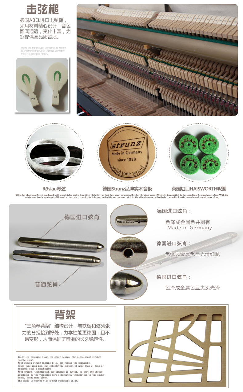 弦軸:德國鋼琴弦軸,質地均勻,不易斷裂,具有高精度和光滑度的特點。專業性強,與弦軸板組合更加嚴密,可承受琴弦的最大張力,不 易松動,為您提供更加穩定的音色。