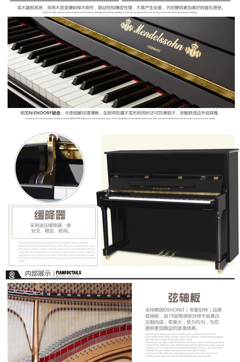 踏板系統(tǒng):實(shí)木踏板系統(tǒng),采用木質(zhì)堅(jiān)硬的櫸木制作,聯(lián)動(dòng)性和穩(wěn)定性強(qiáng),經(jīng)久耐用,腳感舒適,不易產(chǎn)生雜音,為您提供更加純凈的音樂(lè)感受。