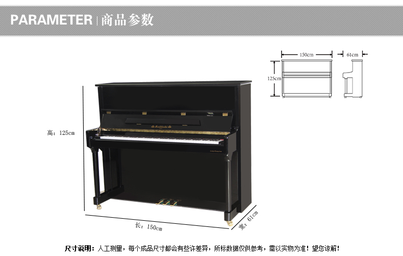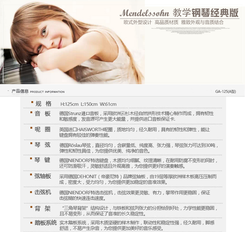 采用彰顯尊貴的歐式外型設(shè)計(jì),精選高品質(zhì)材質(zhì),雅致外觀與超凡音質(zhì)相結(jié)合。德國(guó)高級(jí)技師手工組裝制作,專業(yè)的制琴工藝和嚴(yán)謹(jǐn)?shù)墓?作態(tài)度保證了每一架進(jìn)口系列鋼琴的卓越品質(zhì)。同時(shí),每一架進(jìn)口系列鋼琴在出廠時(shí)都須經(jīng)過(guò)嚴(yán)格的檢驗(yàn)、調(diào)試、整理,保證每位使用者都 能感受到它的純真的音質(zhì)。