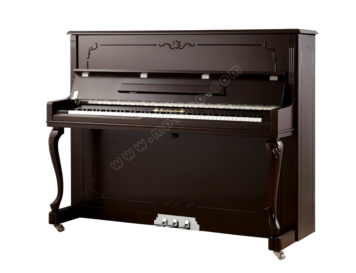 胡桃木色亞光琴身,大搖蓋,單琴耳,小譜架,大弧形彎腿雕有線形花紋,上、下門刻有精致的花枝、花蔓,盡顯浪漫、優雅。