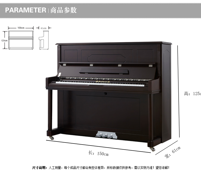 2.音板:云杉實木復合音板,采用自然拱形法技術加工,使音板彈性更強,發音源產生更大能量。沙子測量音板厚度技術,小提琴制作工藝,讓鋼琴發生更準確。