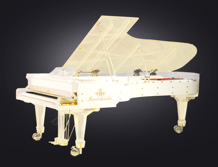 采用現代高科技環保材料,琴身通體晶瑩剔透、炫目璀璨。流暢舒展的線條、水晶透明的直琴腿、搭配簡潔大氣的水晶譜架,每一處細節都彰顯出澄凈的靈氣和王者的尊貴,宛若一座夢幻的水晶宮殿,承載著音樂和夢想,任琴聲回蕩在湛藍純凈的天空。