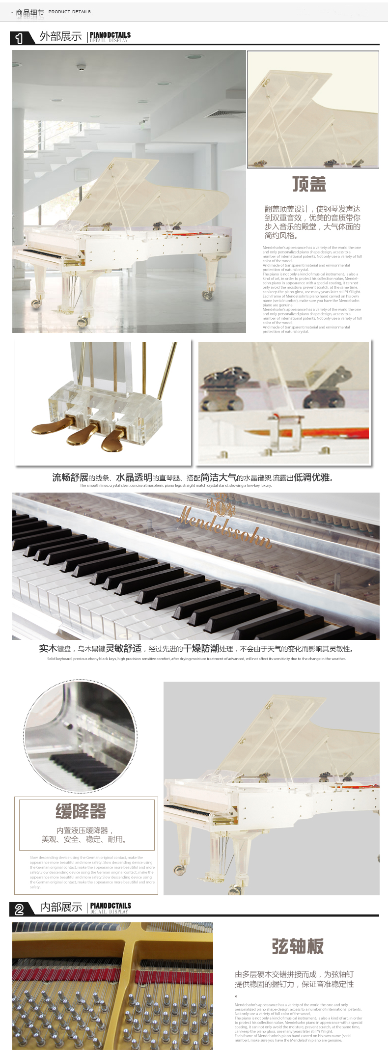 實木鍵盤、烏木黑鍵,德國R?slau(羅斯勞)琴弦、德國ABEL擊弦槌、德國原裝進口音板