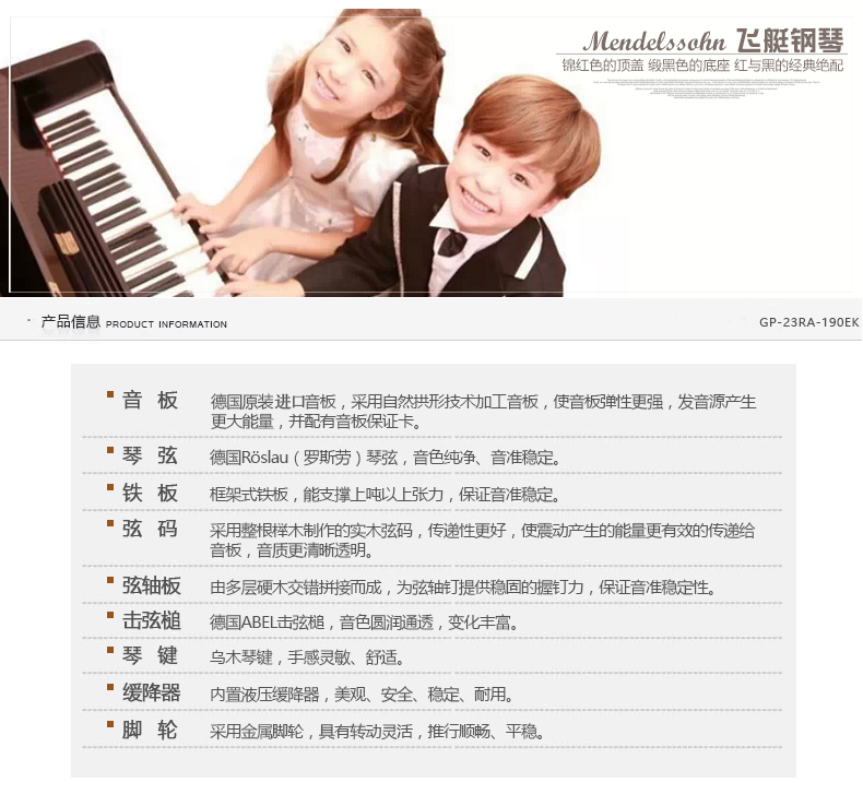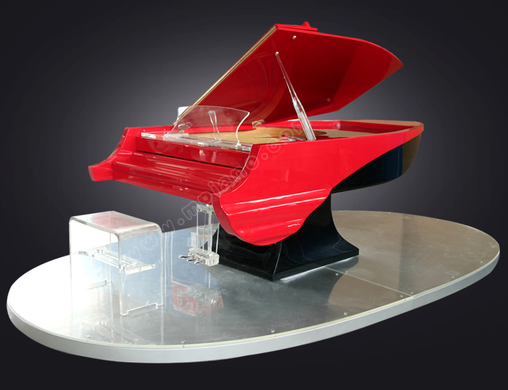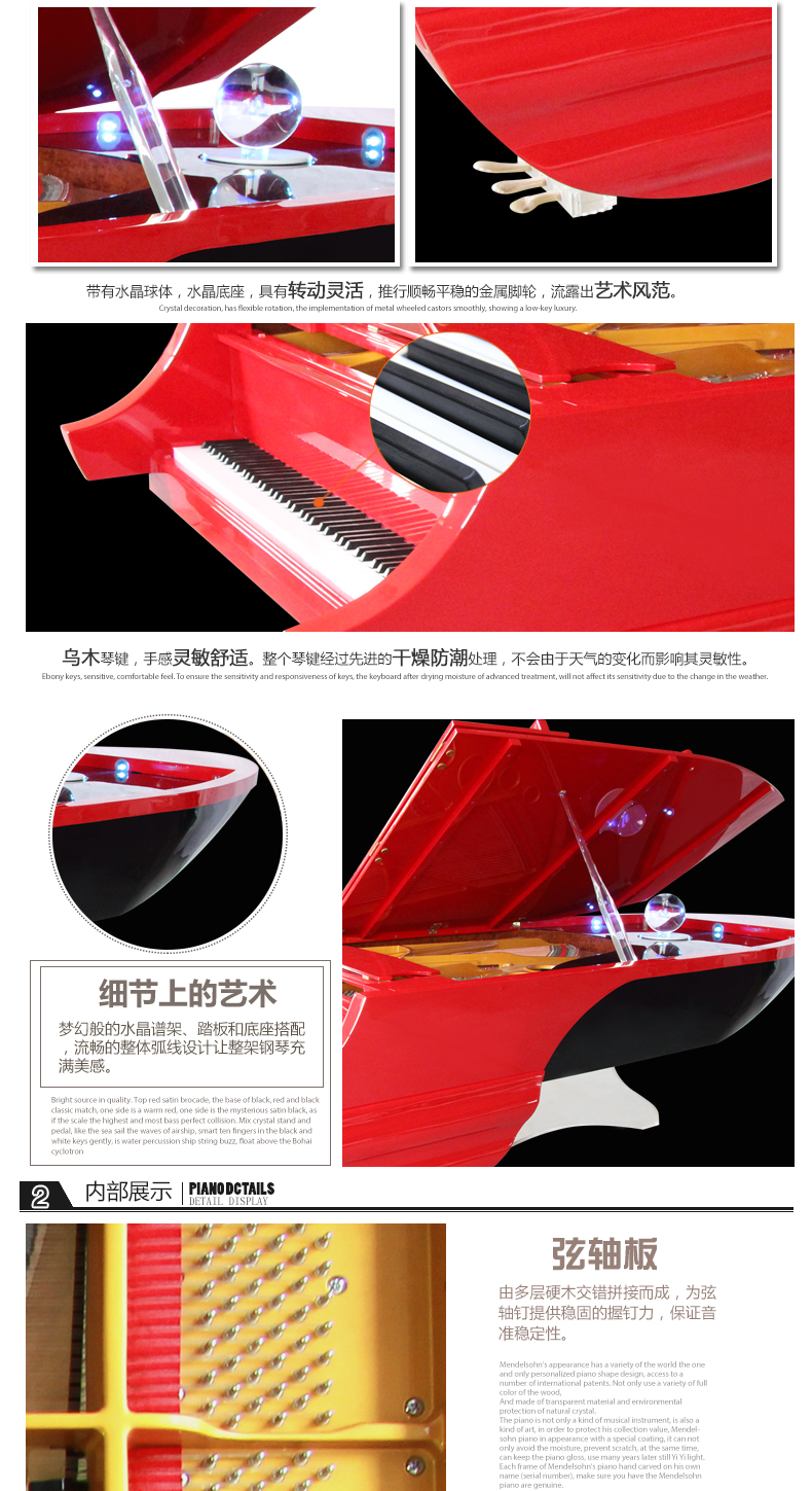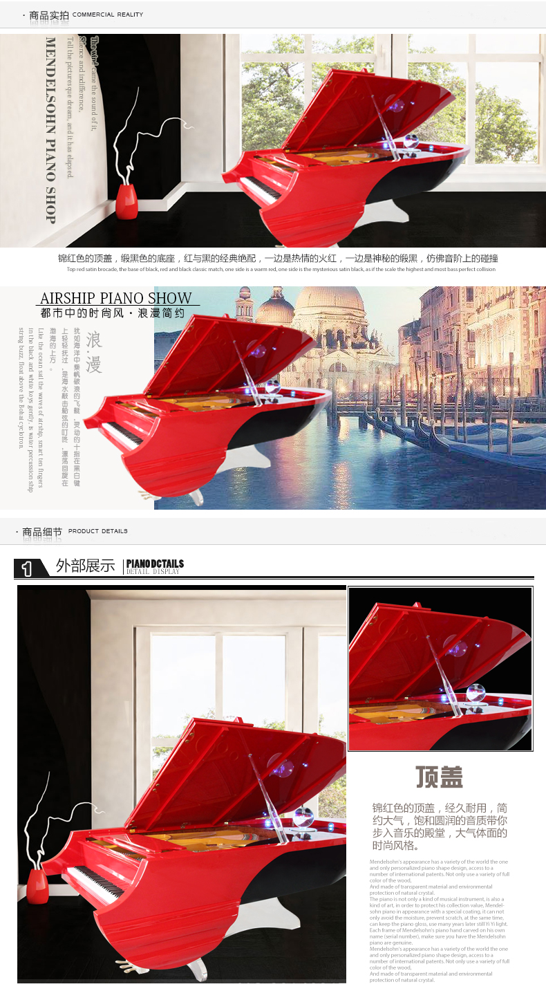 璀璨源于品質,尊貴源于細節,奢華亮麗的飛艇外觀設計,錦紅色的頂蓋、段黑色的底沿,與夢幻般的水晶譜架、踏板和底座相搭配,流暢的整體弧線設計讓整架鋼琴充滿美感。