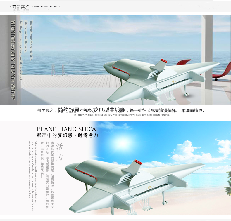 “飛機”鋼琴的設計理念源自人們對于理想的追求,展現了現代科技與未來的 延伸。當激揚優越的琴聲響起,閉目聆聽,仿佛置身于無垠的天際,