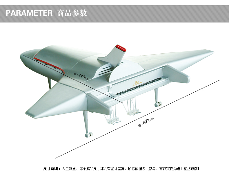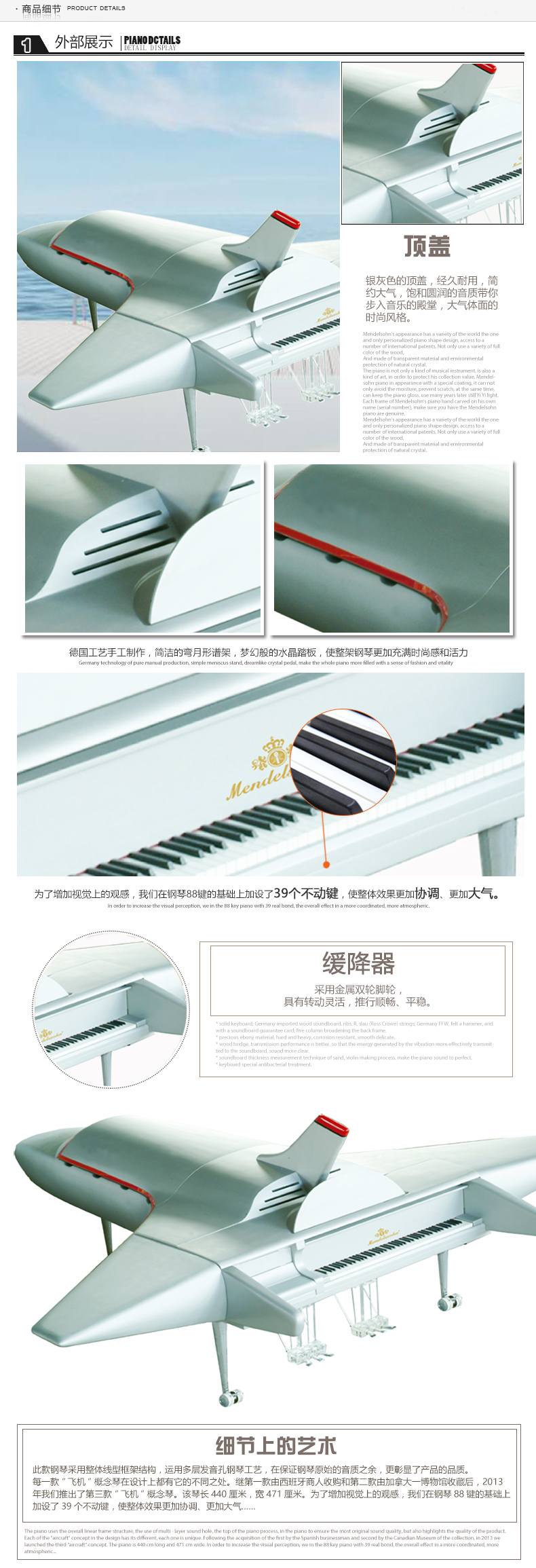 推出了第三款“飛機”概念琴。該琴長440厘米,寬471厘米。為了增加視覺上的觀感,我們在鋼琴88鍵的基礎上加設了39個不動鍵,使整體效果更加